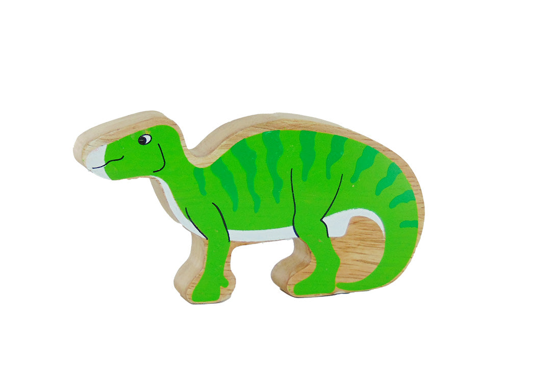 Our chunky wooden iguanadon figure has an green design with a beautiful wood grain edge – each one is unique!