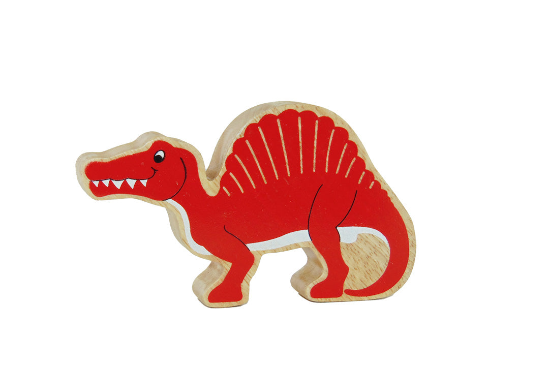 Our chunky wooden spinosaurus figure has a red design with a beautiful wood grain edge – each one is unique!