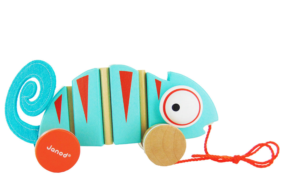 Ready for a walk in the tropics? Take your little one on an adventure with this wooden pull-along chameleon! This toy features a funny appearance, rolling eyes, and an articulated body that moves as it rolls along. The soft felt tail adds to the charm and makes this early years toy a delightful addition to any family.